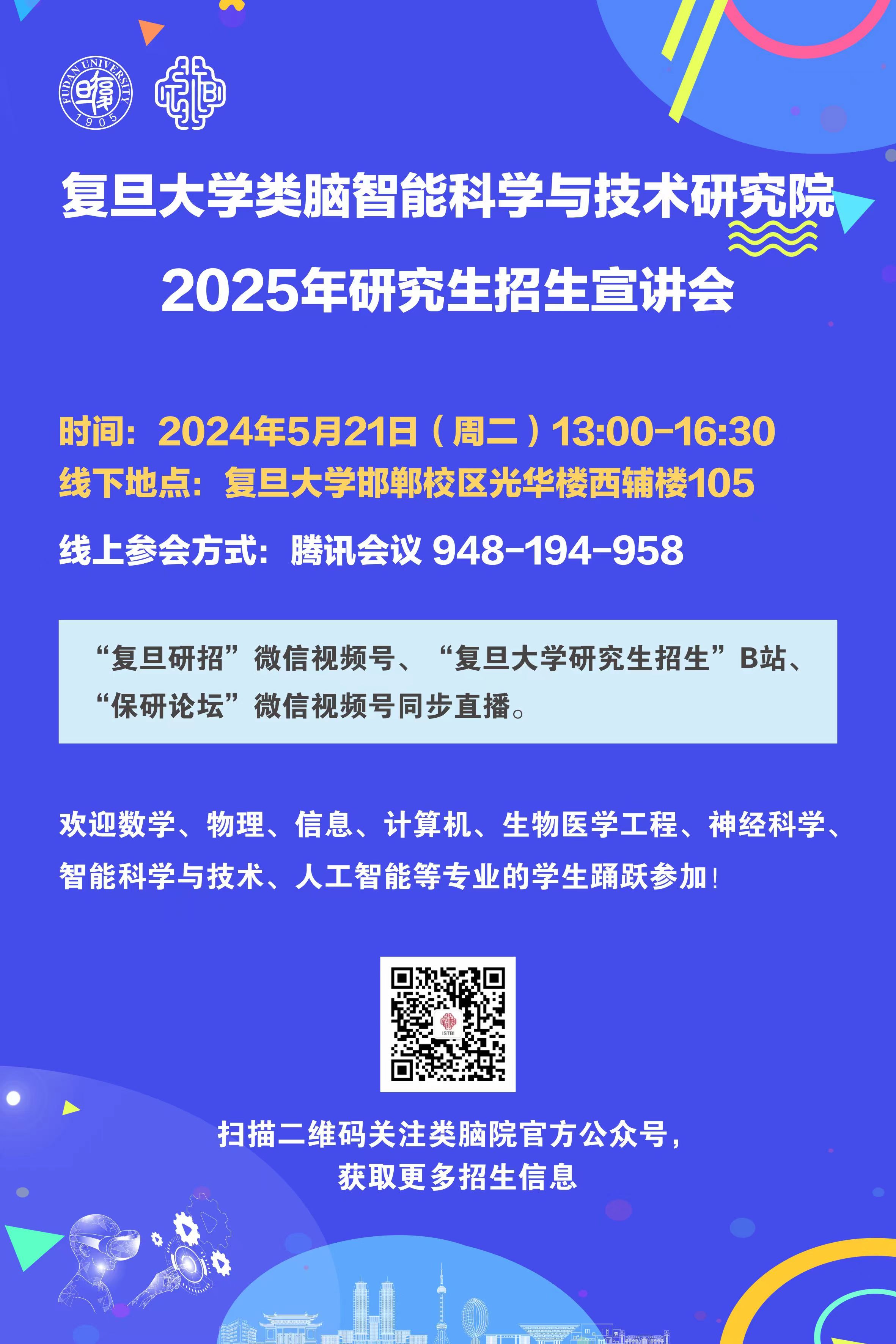 | 085 | 类脑智能科学与技术研究院 | 2025年研究生招生宣讲会 | 5月21日13:00-16:30 点点官网入口邯郸校区光华楼西辅楼105 | 腾讯会议(会议号:948 194 958) |