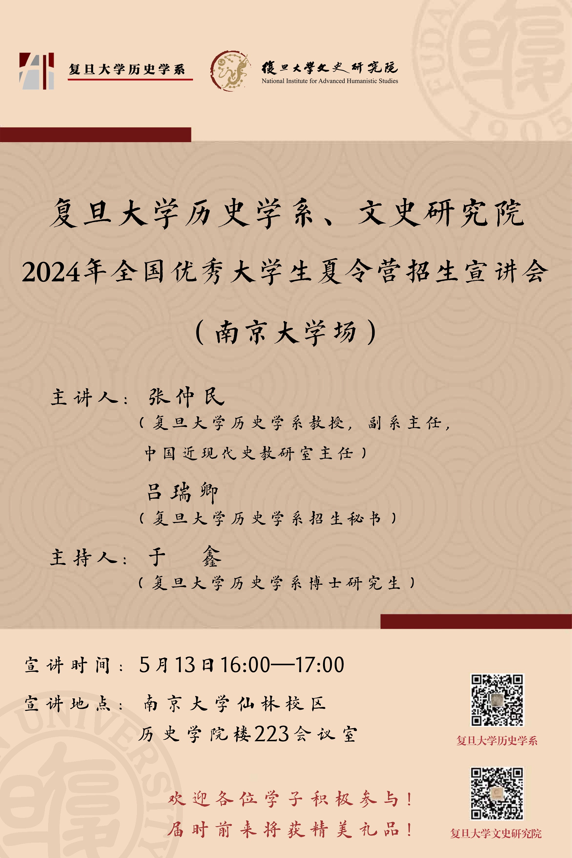 | 014 | 历史学系 | 全国优秀大学生夏令营招生宣讲会(南京大学场)(主讲人:张仲民) | 5月13日16:00-17:00 | 南京大学仙林校区历史学院楼223会议室 |