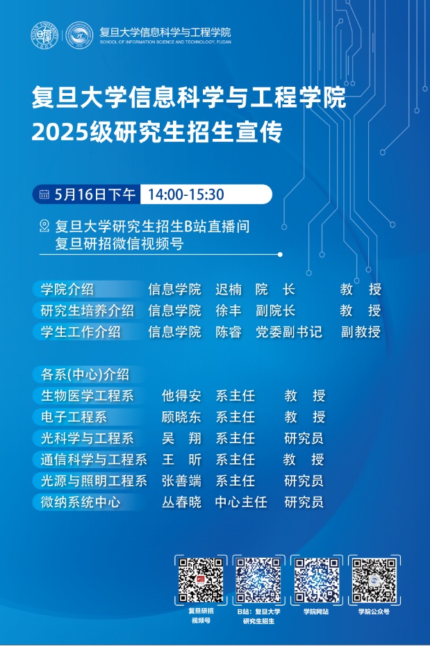 | 072 | 信息科学与工程学院 | 2025级研究生招生宣传(主讲人:迟楠、徐丰、陈睿、他得安、顾晓东、吴翔、王昕、张善端、丛春晓) | 5月16日14:00-15:30 | |