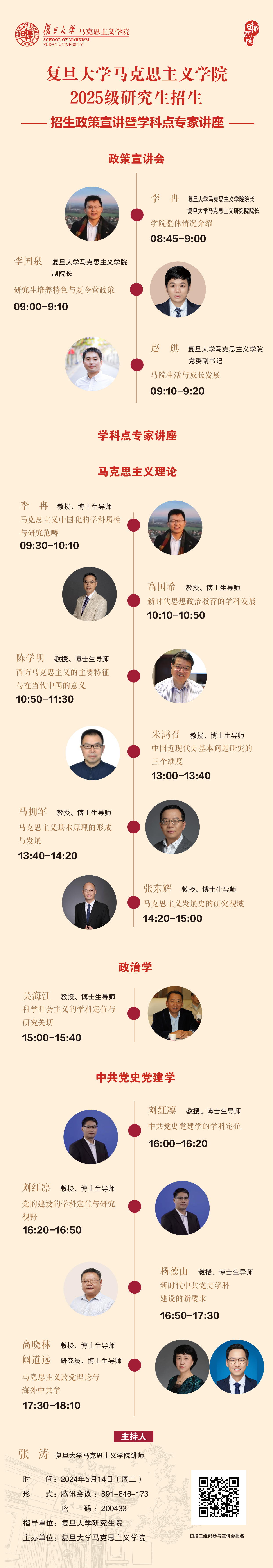 | 4.社政学院专业学位研究生培养特色与招生政策(主讲人:何立民、王崇) | 5月15日15:00-17:00 | 腾讯会议(会议号:975 192 220,密码:240515) B站:“点点官网入口研究生招生” 微信视频号:“复旦研招” | ||