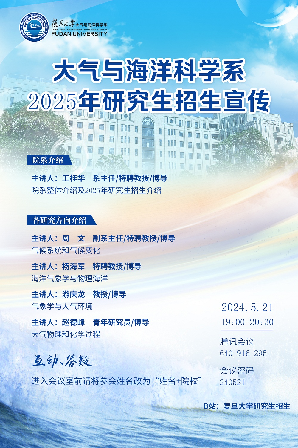 | 302 | 大气与海洋科学系 | 2025年研究生招生宣传 | 5月21日19:00-20:30 | |
