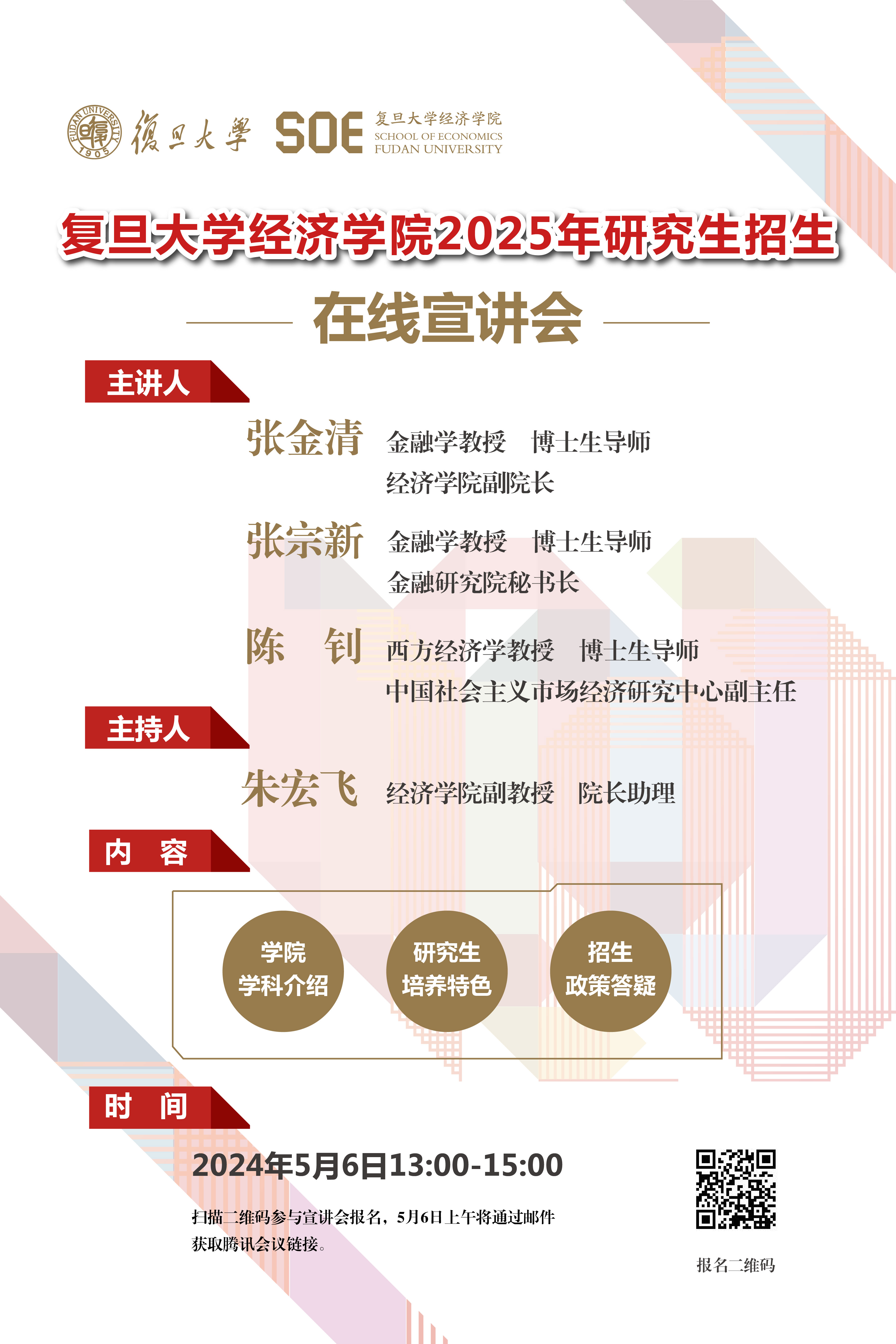 | 068 | 经济学院 | 经济学院2025年研究生招生在线宣讲会(主讲人:张金清、张宗新、陈钊) | 5月6日13:00-15:00 | |