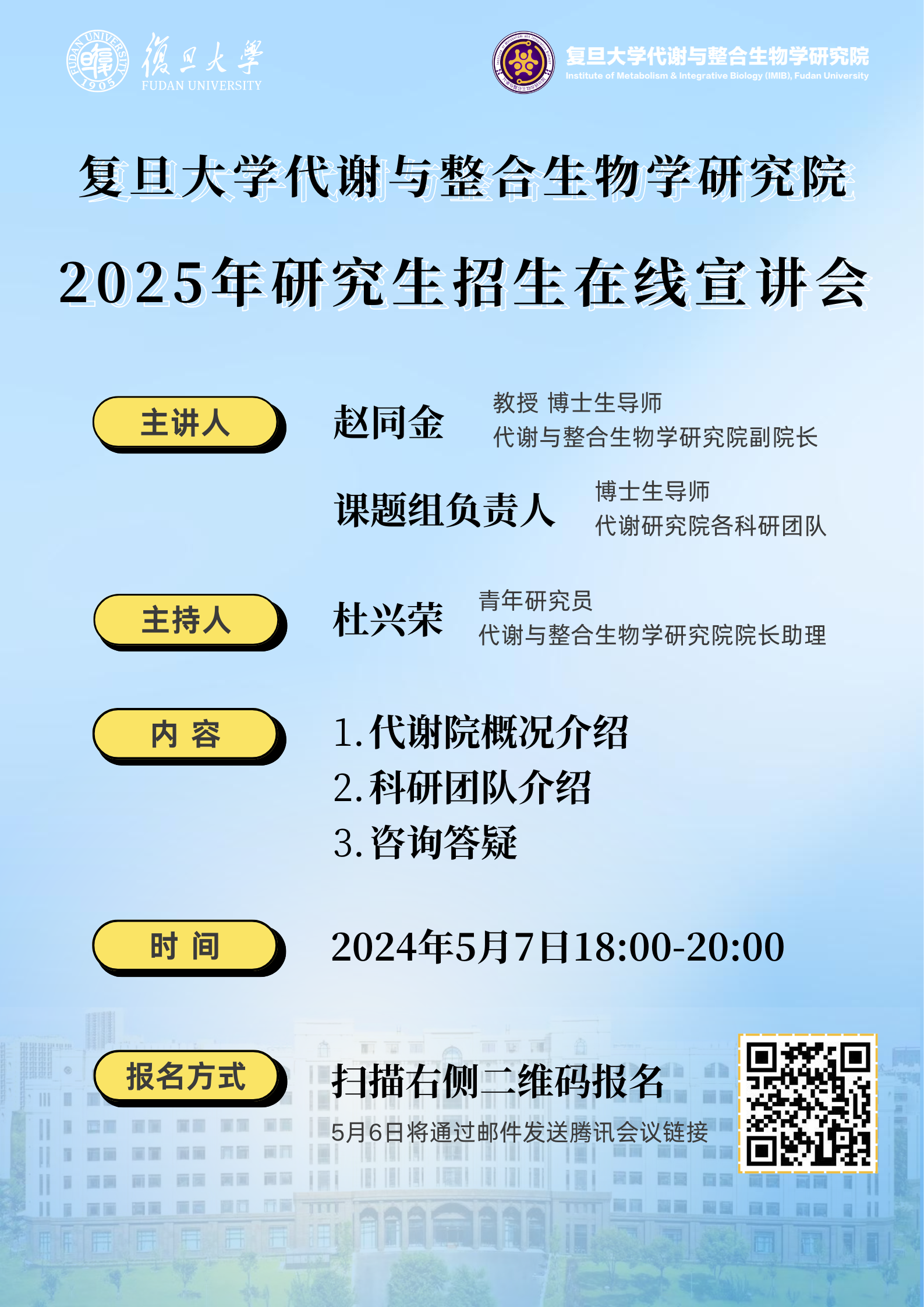 | 088 | 代谢与整合生物学研究院 | 2025年研究生招生在线宣讲会(主讲人:赵同金) | 5月7日18:00-20:00 | |