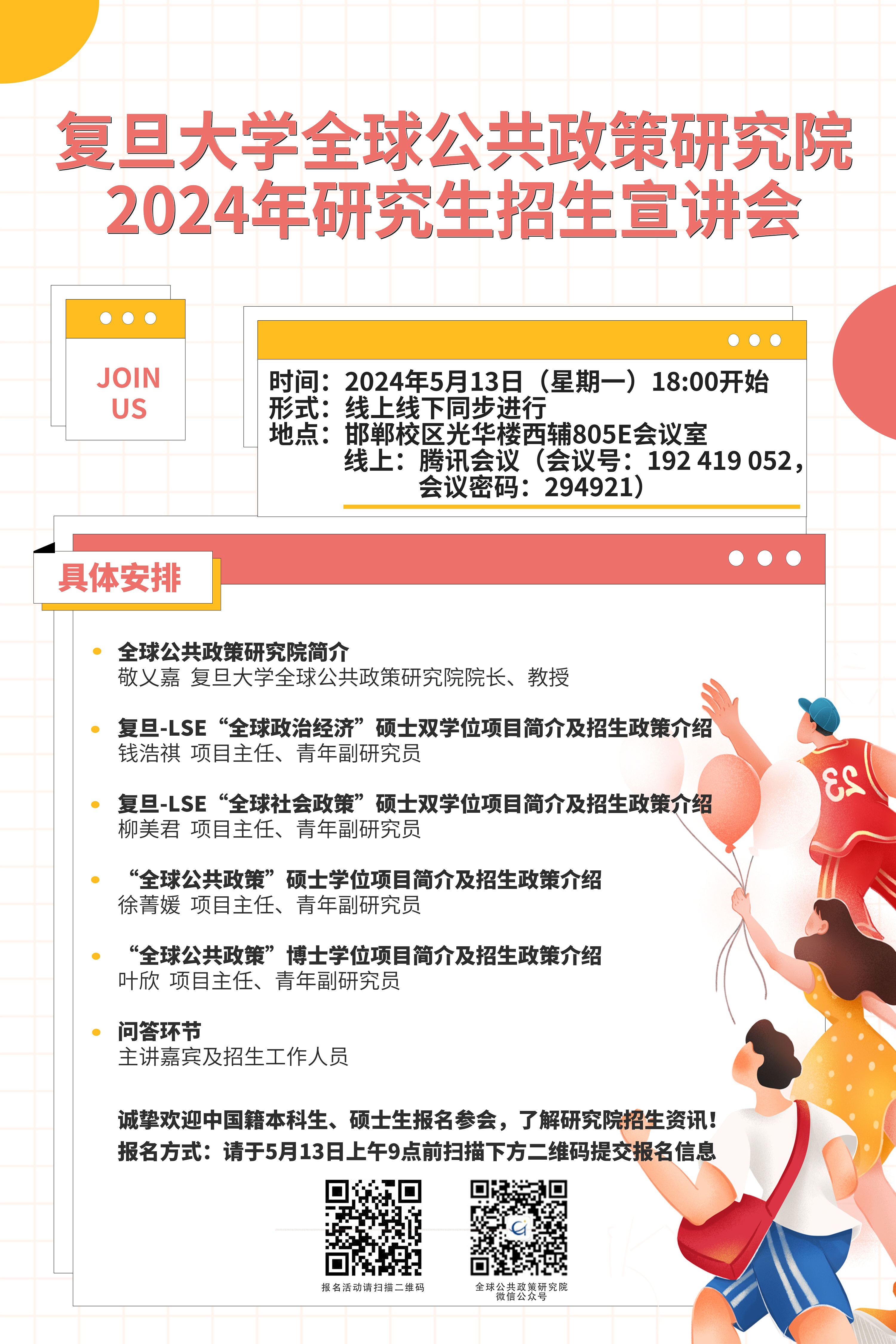 | 3.社会政策硕士专业学位项目的培养方案和特色(主讲人:刘欣) | 5月15日18:30-20:00 | 腾讯会议(会议号:975 192 220,密码:240515) B站:“点点官网入口研究生招生” 微信视频号:“复旦研招” | ||