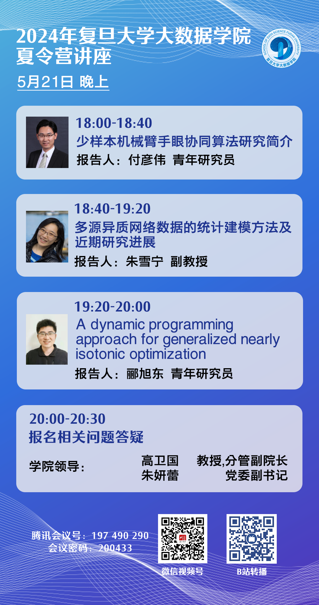 | 098 | 大数据学院 | 大数据学院夏令营讲座(主讲人:付彦伟、朱雪宁、郦旭东) | 5月21日18:00-20:30 | |