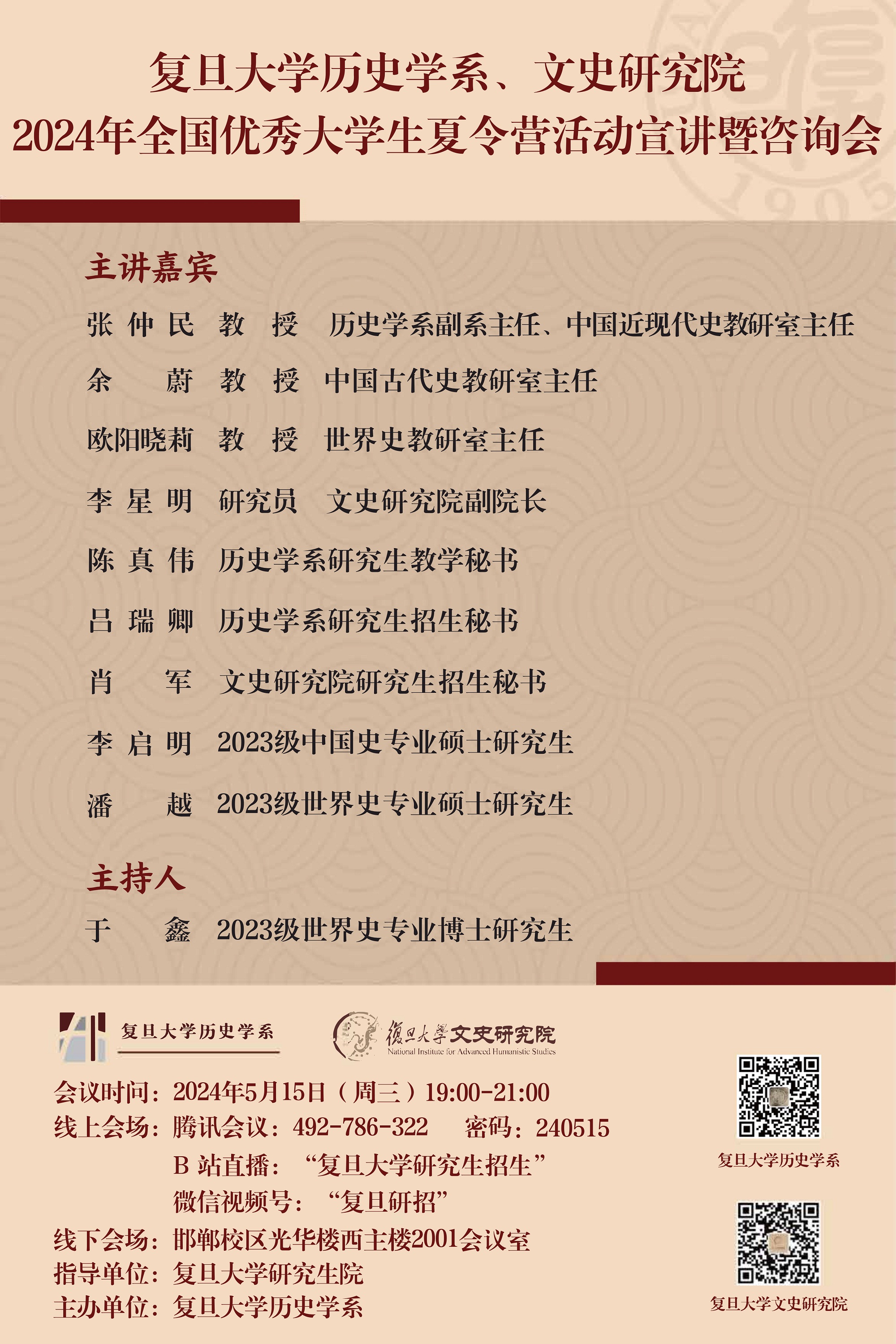 | 014 | 历史学系 | 点点官网入口历史学系(含文史研究院)2024年全国优秀大学生夏令营活动宣讲暨咨询会(主讲人:张仲民、余蔚、欧阳晓莉、李星明、陈真伟、吕瑞卿、肖军、李启明、潘越、于鑫) | 5月15日19:00-21:00 | 腾讯会议(会议号:492 786 322,密码:240515) B站:“点点官网入口研究生招生” 微信视频号:“复旦研招” |