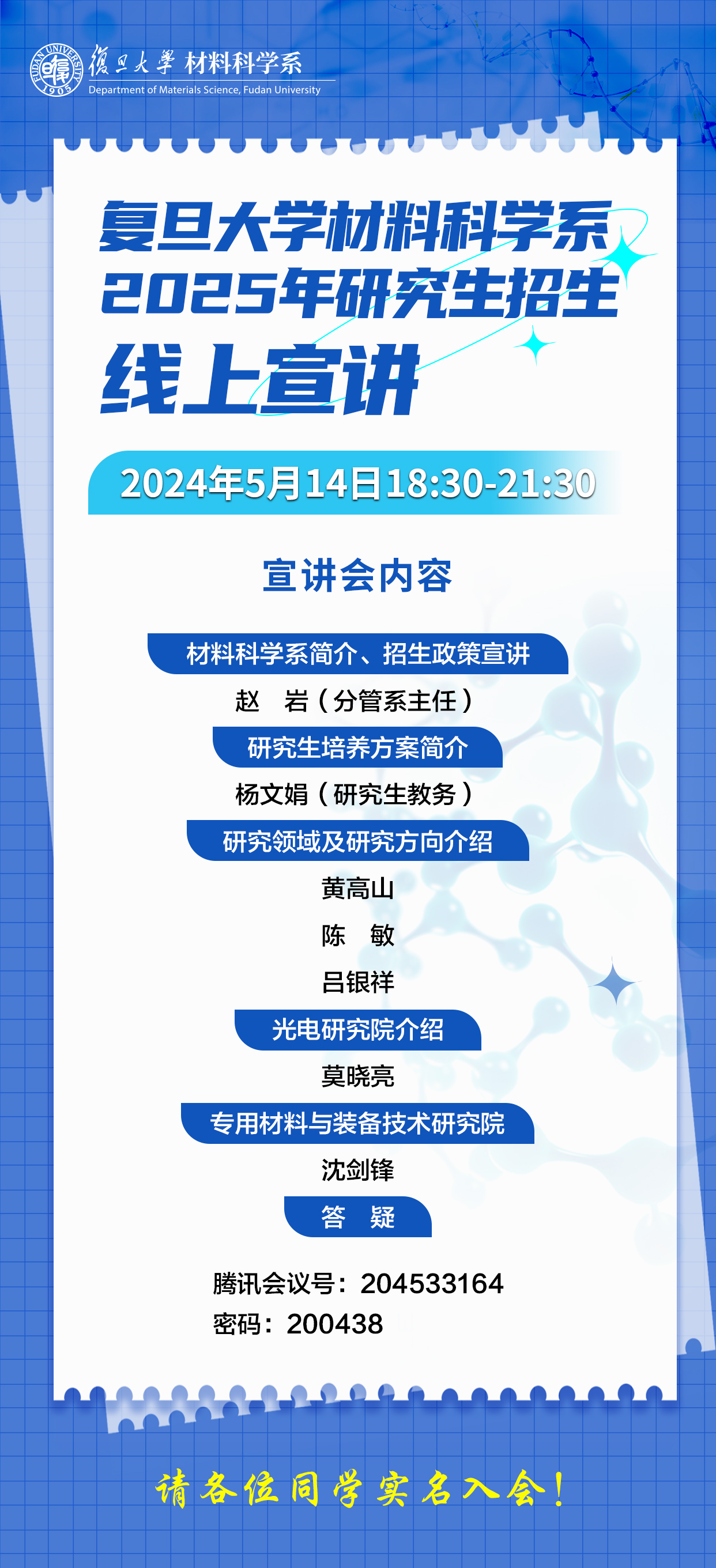 | 030 | 材料科学系 | 2025年研究生招生线上宣讲 | 5月14日18:30-21:30 | |