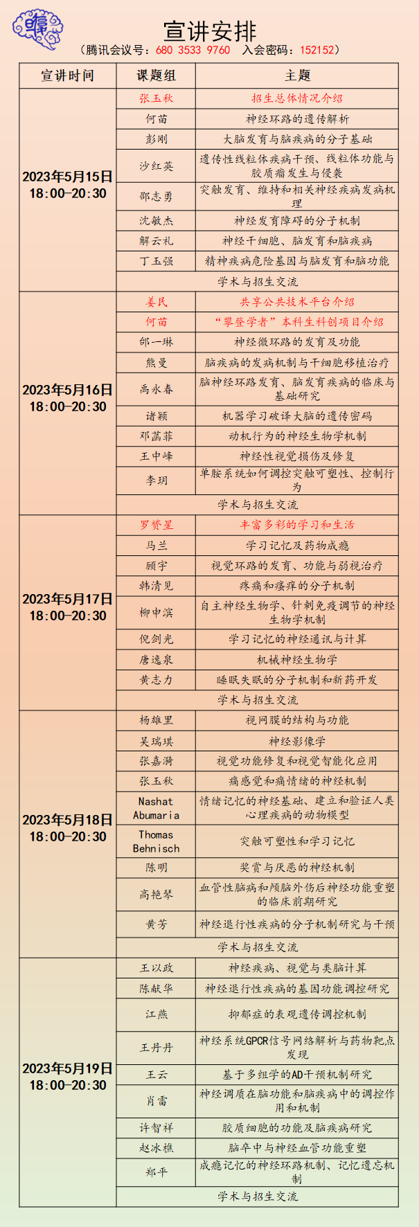 | 152 | 脑科学研究院 | 5月15日-19日 | 腾讯会议 |