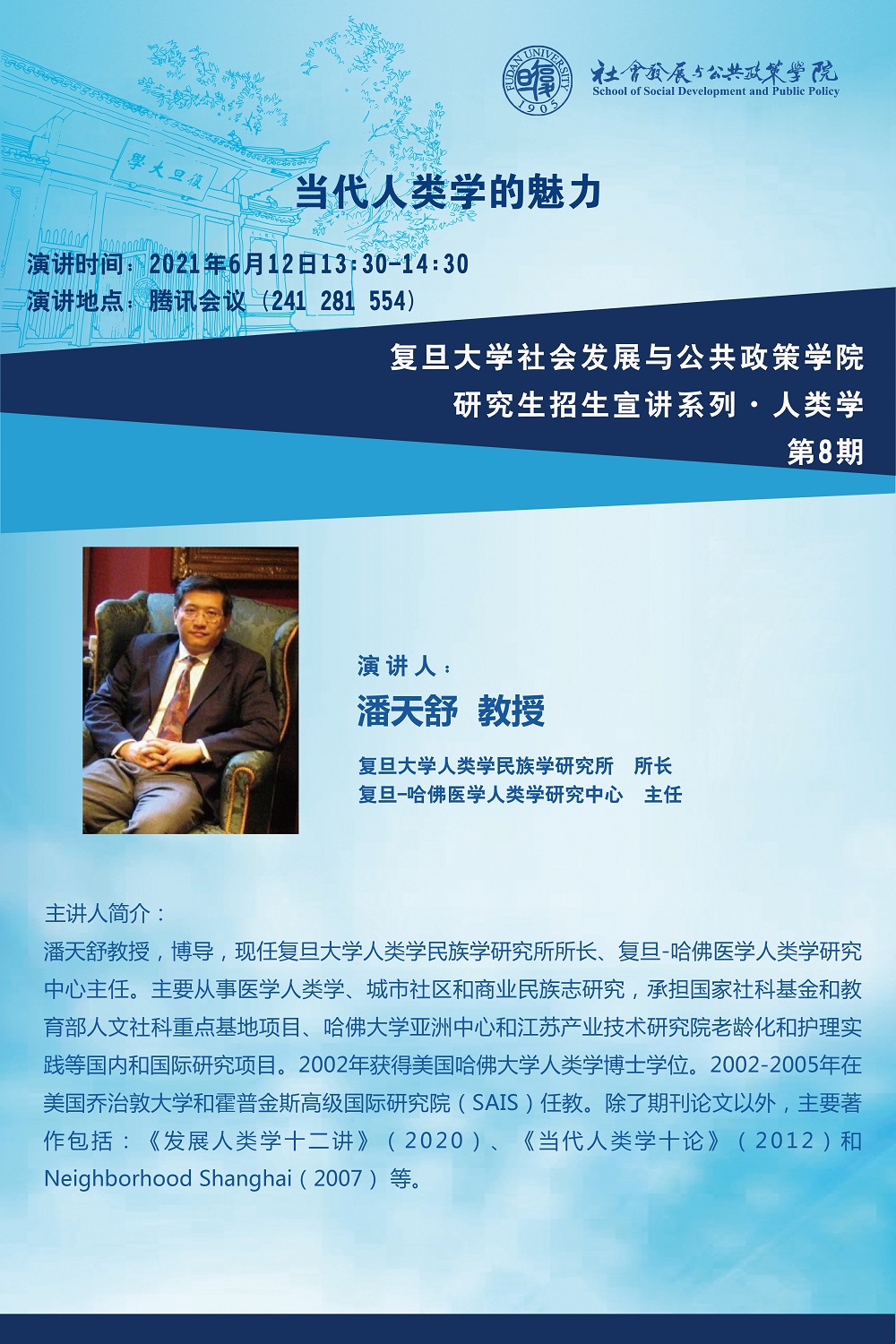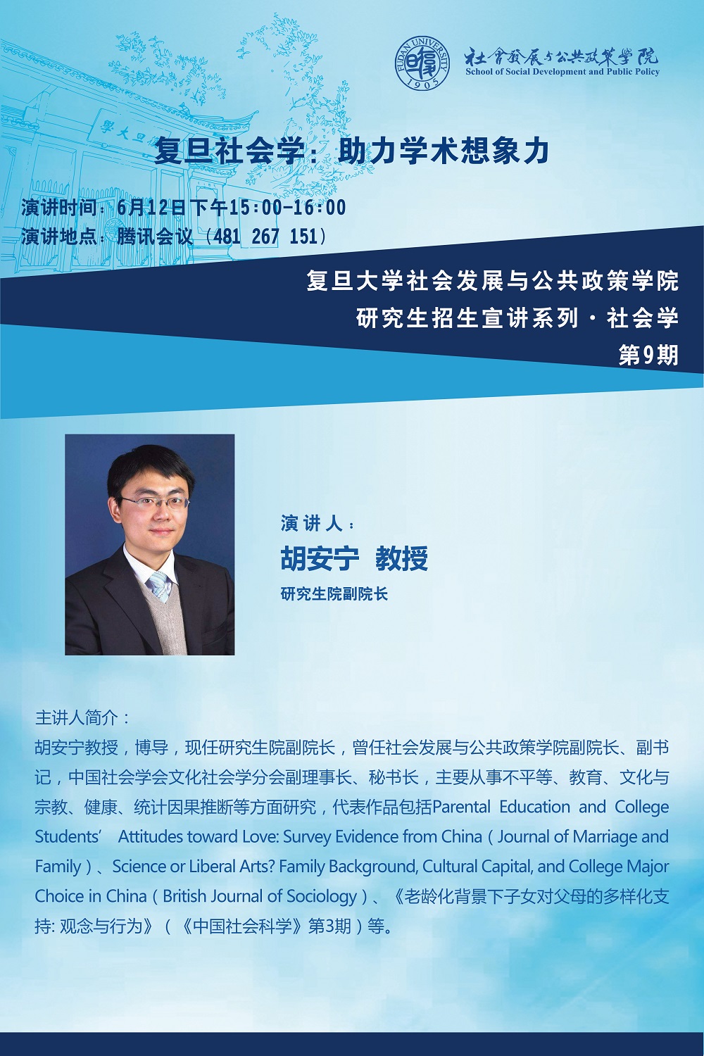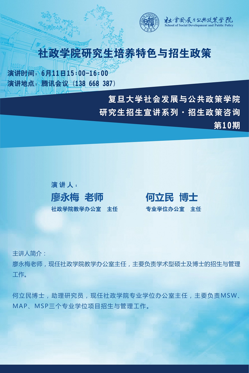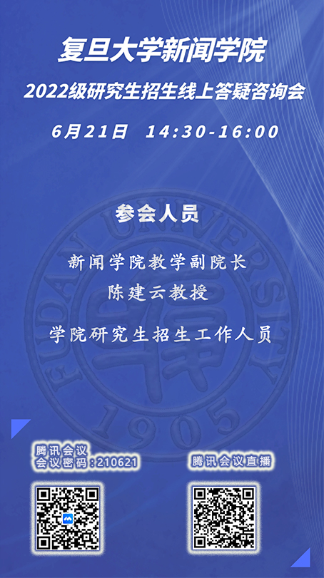 | 017 | 国际关系与公共事务学院-MPA招生咨询会 | 6月27日 | 腾讯会议 | https://mp.weixin.qq.com/s/F0G_9LTjZ-X_VKYYtsp2WQ |