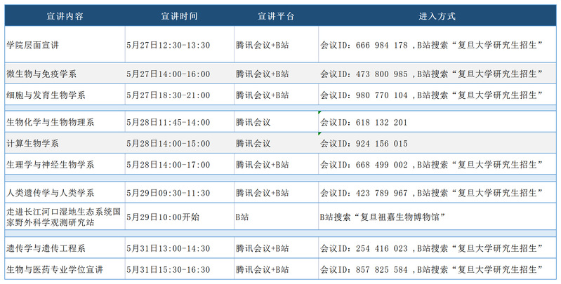 | 070 | 生命科学学院 | 5月27、28、29、31日 | 腾讯会议+B站 | |
